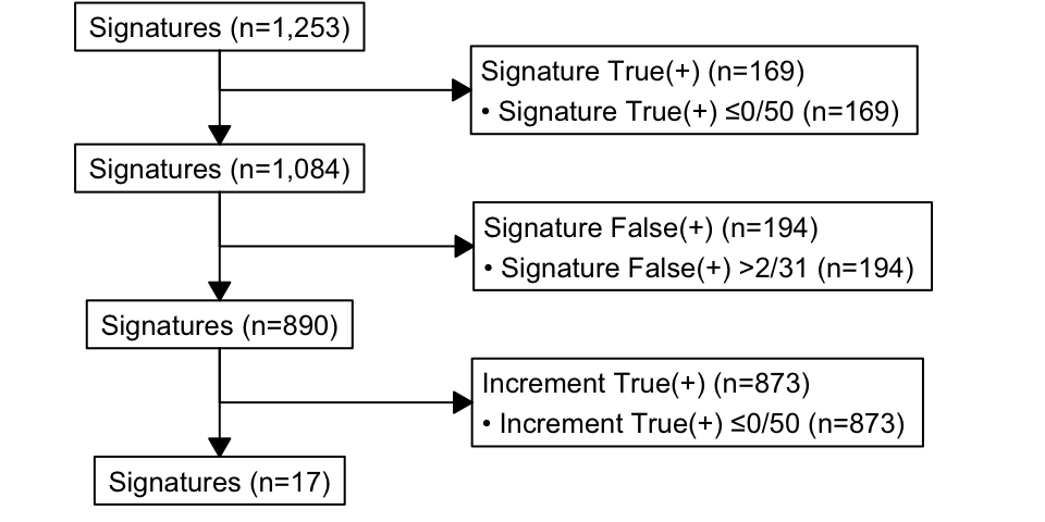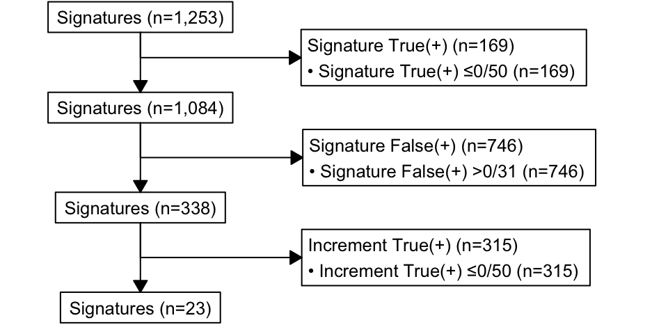 <positive.subjects>identified in the training cohort, from most to least; - Sequentially retain variant-signatures such that each retained signature identifies at least one additional